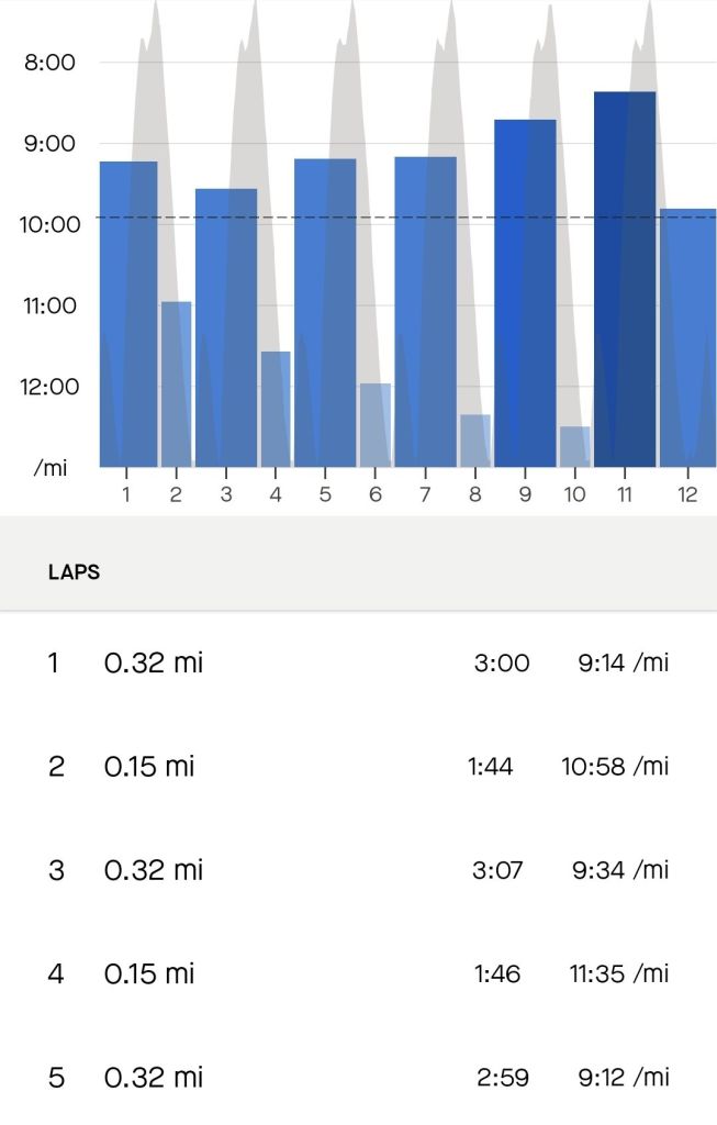 It was a looped session under the troll bridge and up round to the top of the park. The downhill section at the end of the loop was the recovery.
